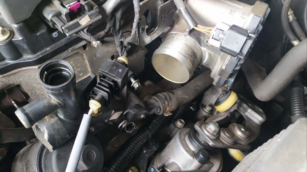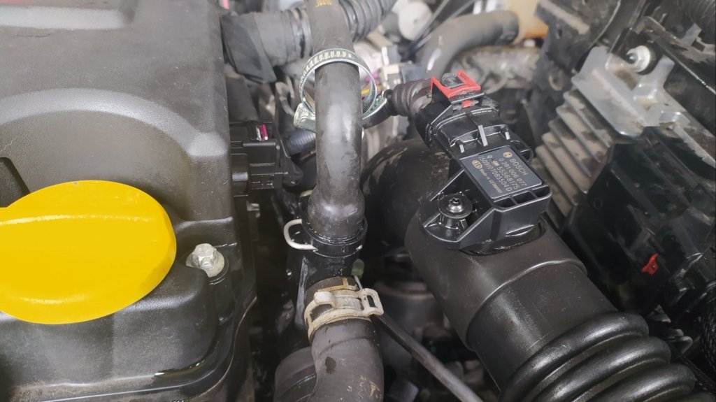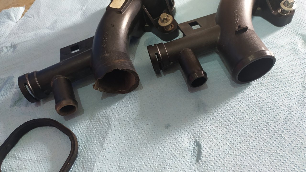 Abych mohl nouzově dojet pro novou, uřízl jsem zesílený konec původní hadice a nacpal ho na nátrubek který je na mezikusu do termostatu a zaškrtil páskou. Koupil jsem z cenových důvodů bežně dostupnou neoriginální hadičku za 250,- vyměnil a je to ok.
