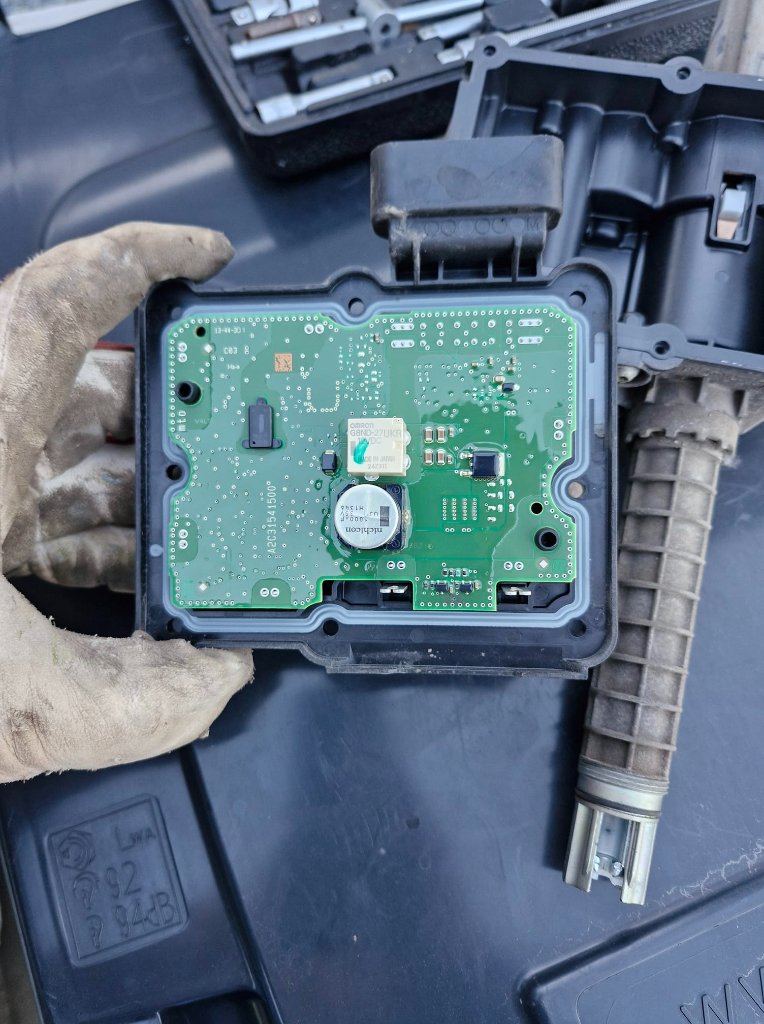 Odpíchni se od toho relé, na kterém snad vidím OMRON G8ND-27UKR. Jakmile cvakne, tak bych změřil, jestli sepne napětí. To by mělo dál jít na motor brzdy, takže bych proměřil, jestli se objeví na konektoru té jednotky (na fotce vpravo nahoře) a jestli dorazí po kabelech do motoru brzdy (ten vidím na fotce pod jednotkou). Uvnitř motoru bude řídící elektronika a nejspíš i spínače, aby ta hlavní jednotka věděla, v jakém stavu brzda je, ale ten jsi měnil, takže by v něm mělo být vše v pořádku.