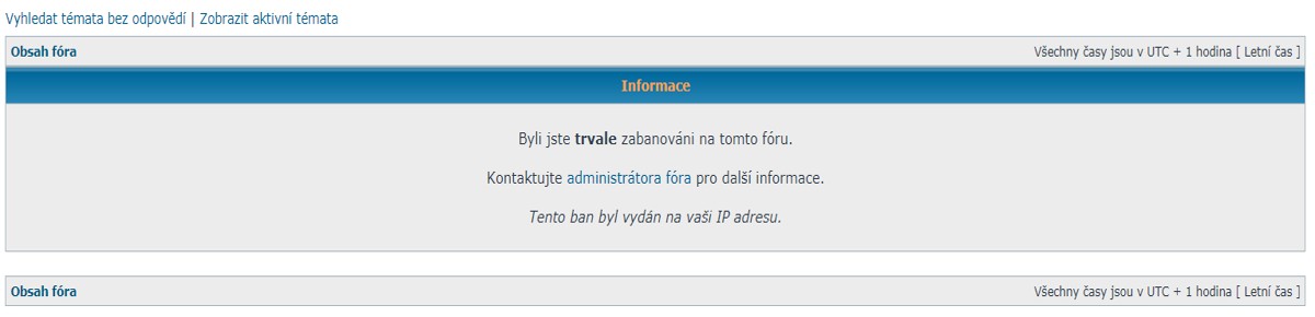 Ahoj! Asi před hodinou jsem chtěl otevřít stránky tohoto fóra, kde jsem registrován od února 2012, víceméně trvale přihlášen a na stránky chodím denně, a po kliknutí na adresu na mě vyskočilo sdělení, že mi byl udělen trvalý ban vztahující se, samosebou, na mou IP adresu. Zkusil jsem podle pokynů napsat mail moderátorovi s prosbou o vysvětlení, mail byl odeslán, avšak doručení bylo vzápětí odmítnuto s odůvodněním Relay access denied (Přístup k přenosu odepřen.) Přiznám se bez mučení, že jsem byl velmi nemile překvapen, překvapení však pokračovalo dál, neboť po asi deseti minutách již otevření stránek normálně fungovalo, jen mě systém odhlásil, musel jsem se znovu zalogovat.
